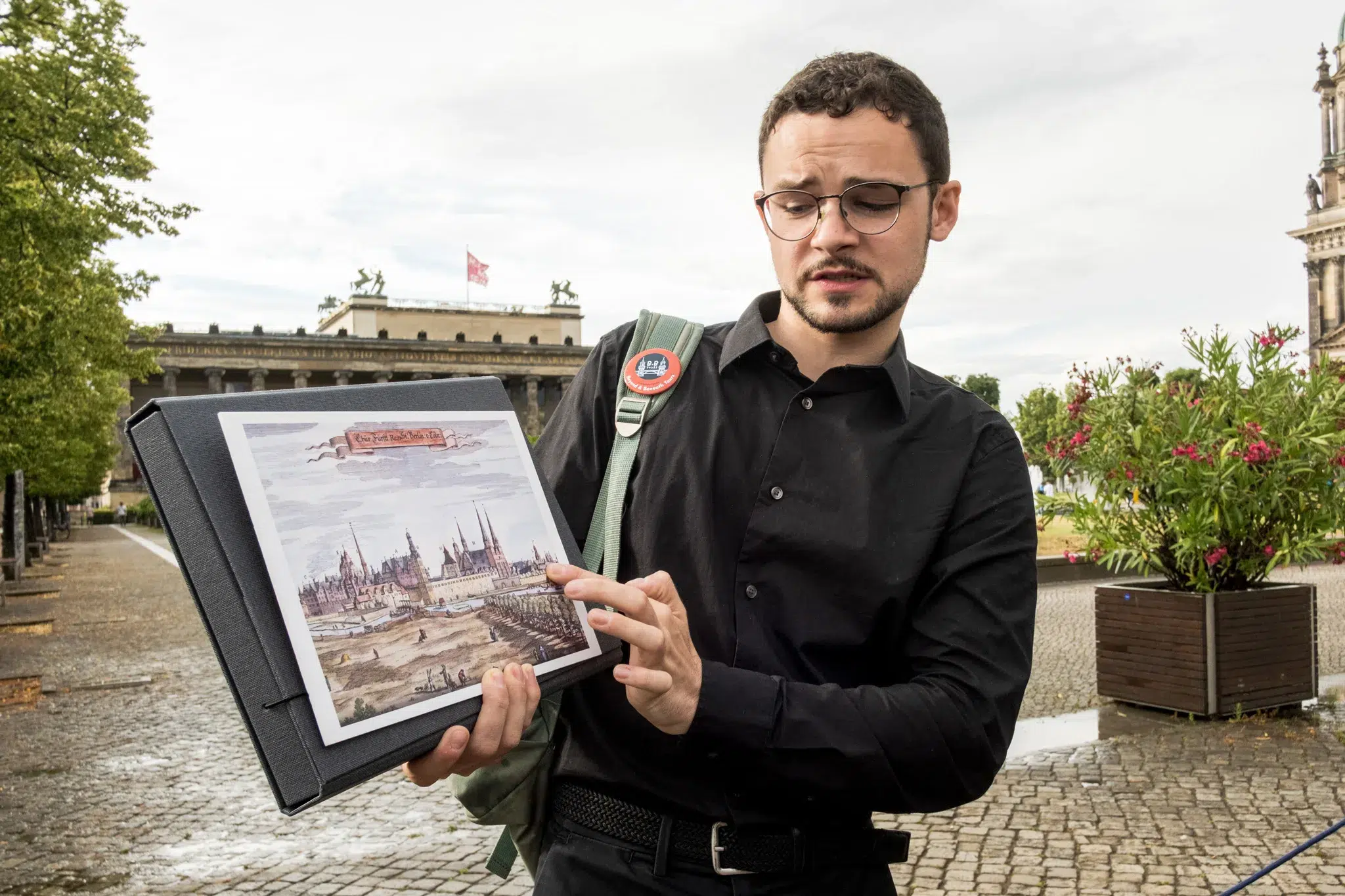 At the โReconstruction of the Sanchi Gateโ (โRekonstruktion des Sanchi-Toresโ) in front of the Humboldt Forum. Look for our guide with the orange umbrella!